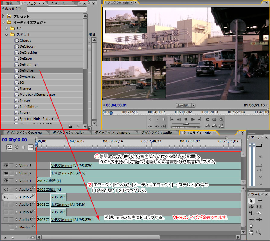 (映像を使わない、VHS英語.mov と 北京語.mov は、エフェクトコントロールパネルで小さくしておきます。) 表示タイミングが一緒になったら次は、VHS英語.mov の音声のノイズを除去します。 ![]() エフェクトパネルの中の、オーディオエフェクト→ステレオと各フォルダを展開し、 その中の [ DeNoiser ] というエフェクトを、VHS英語.mov の音声トラックへドラッグ&ドロップします。 エフェクトコントロールパネルでパラメータを、Reduction -8.0db に調整すれば、ノイズが除去できます。 VHS英語.mov の音声のみを複製してタイムラインに配置し、 広東語と北京語の使わない音声部分を、エフェクトコントロールパネルでボリュームレベルを 0.0db にします。 (参考画像は、下のほうにあります) エフェクトコントロールパネルで各素材の調整が済んだら、次はトラックの音声を調整します。 ![]() オーディオミキサーパネルを開き、各音声トラックのボリュームレベルを均一にします。 各音声トラックの マスターレベルのスライダーは触らないで、各トラックのスライダーを動かして調整します。 必要があれば、各素材に戻って、エフェクトコントロールパネルでボリュームレベルを調整します。 * * * * * * * * * * * * * 音声の調整が済んだら、広東語の音声を書き出します。 ![]() メインメニューの [ シーケンス ] → [ ワークエリアをレンダリング ] をクリックします。 ![]() オーディオのレンダリングは、13分ほどかかります。100%になって、 ビデオのレンダリングに切り替わったら、[ キャンセル ] ボタンをクリックします。 メインメニューの [ ファイル ] → [ 書き出し ] → [ オーディオ ] をクリックします。 ![]() ファイル名を、[ Cantonese.aif ] と入力して、[ 保存 ] ボタンをクリックします。 ![]() メインメニューの [ シーケンス ] → [ レンダリングを削除 ] をクリックします。 ![]() 警告BOXが出ますが、[ OK ] ボタンをクリックします。これで、広東語の音声は終了です。 * * * * * * * * * * * * * 次に、北京語の音声を書き出します。 ![]() メインメニューの [ シーケンス ] → [ ワークエリアをレンダリング ] をクリックします。 ![]() オーディオのレンダリングは、13分ほどかかります。100%になって、 ビデオのレンダリングに切り替わったら、[ キャンセル ] ボタンをクリックします。 メインメニューの [ ファイル ] → [ 書き出し ] → [ オーディオ ] をクリックします。 ![]() ファイル名を、[ Pekingese.aif ] と入力して、[ 保存 ] ボタンをクリックします。 ![]() メインメニューの [ シーケンス ] → [ レンダリングを削除 ] をクリックします。 ![]() 警告BOXが出ますが、[ OK ] ボタンをクリックします。これで、北京語の音声は終了です。 * * * * * * * * * * * * * 次に、英語の.movを書き出します。 ![]() メインメニューの [ シーケンス ] → [ ワークエリアをレンダリング ] をクリックします。 ![]() オーディオのレンダリングは、13分ほどかかります。100%になったあと、 ビデオのレンダリングが、0%から始まります。1フレームずつなのでかなりかかります。 メインメニューの [ ファイル ] → [ 書き出し ] → [ ムービー ] をクリックします。 ![]() ファイル名を、[ 2005.mov ] と入力して、[ 保存 ] ボタンをクリックします。 ![]() これで、英語の.movは終了です。 * * * * * * * * * * * * * 次に、字幕スーパーをタイピングします。コツコツと・・・